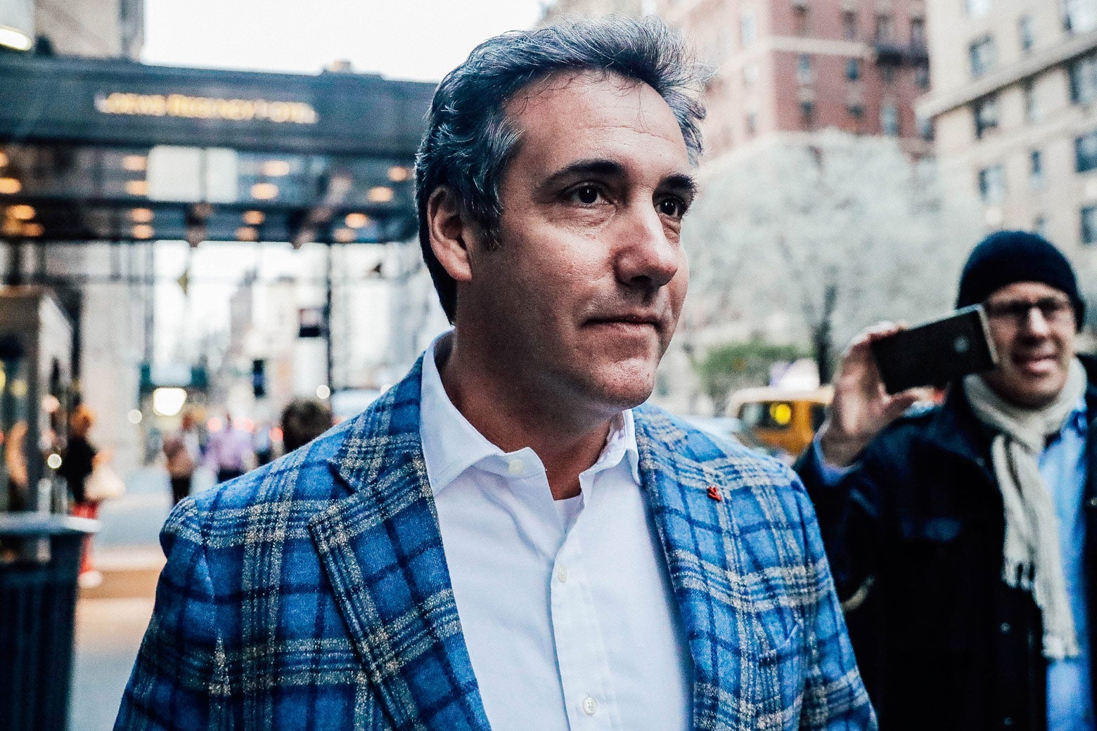 President Donald Trump’s personal lawyer Michael Cohen exits a hotel in New York City on April 13. Photo edited by Slate. Photo by REUTERS/Jeenah Moon.