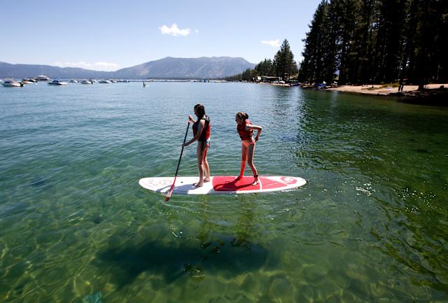 In this Aug. 20, 2019, file photo, Freya Mayo, left, and her sister Evie, of London, England, try out a paddle board on Lake Tahoe near South Lake Tahoe, Calif. The fallout from humanity's addition to plastics is showing up in the waters of Lake Tahoe. Scientists detected microplastics at several locations around the lake for the first time this year and are working to understand what that means for human health and the environment of the Tahoe Basin. (AP Photo/Rich Pedroncelli, File)