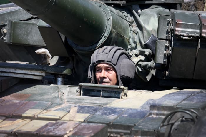 A soldier maneuvers his tank on June 08, 2022 near Sloviansk, Ukraine. In recent weeks, Russia has concentrated its firepower on Ukraine’s Donbas region, where it has long backed two separatist regions at war with the Ukrainian government since 2014. SCOTT OLSON/GETTY IMAGES