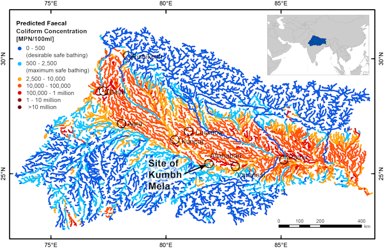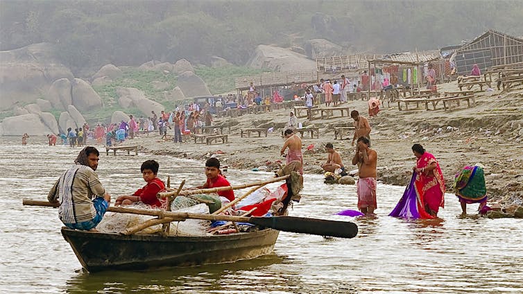 Our own research suggests that as the number of people living in nearby cities increases, the problem with water quality in the Ganges worsens. Urban populations in the Ganges catchment contribute around 100 times more microbial pollution per head to the river than their rural counterparts. This means that untreated sewage discharged from a sewer appears worse for river water quality than sewage discharge where there are no sewers at all.