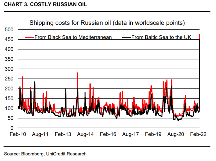 That geopolitical risk premium takes into account not only the risk of damage to oil facilities due to military action or potential Western sanctions, but also reflects soaring insurance costs to ship Russian oil. He observed that freight rates for oil coming out of both the Black Sea and Baltic sea more than tripling over the space of a few days as crude-oil buyers struggled to find shippers willing to send vessels into Russian ports (see chart below).